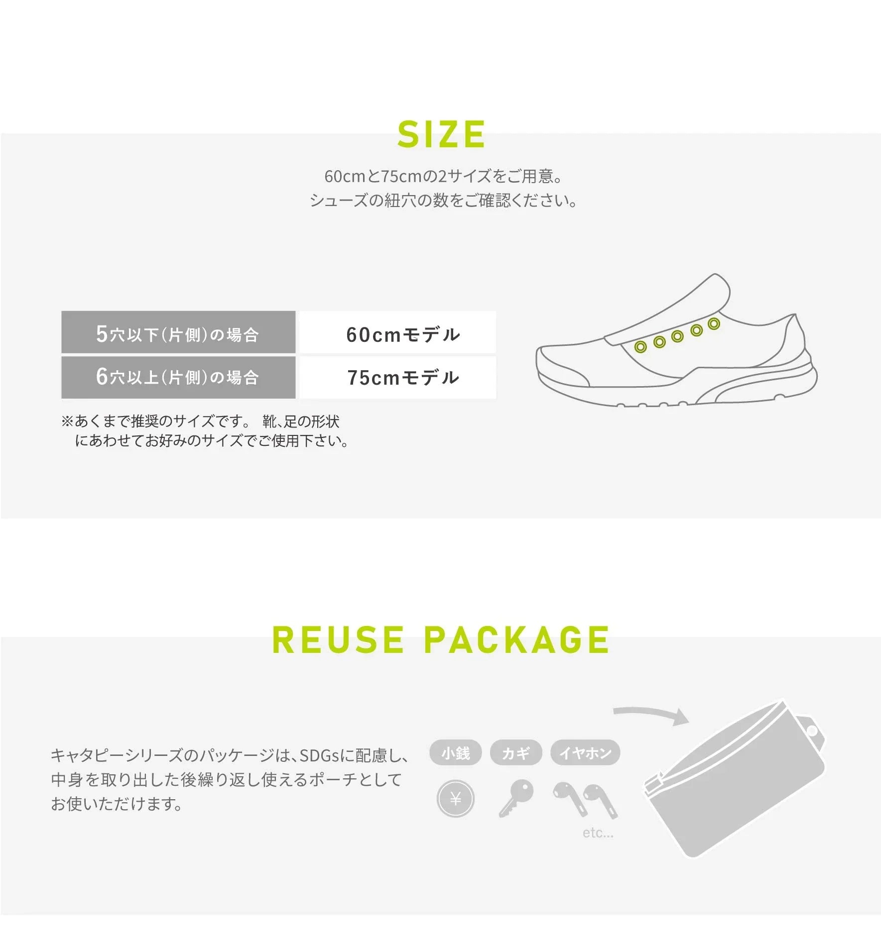 キャタピーには60cmと75cmの2サイズがあります。キャタピーを装着する靴のひも穴の数によってサイズをお選びいただけます。