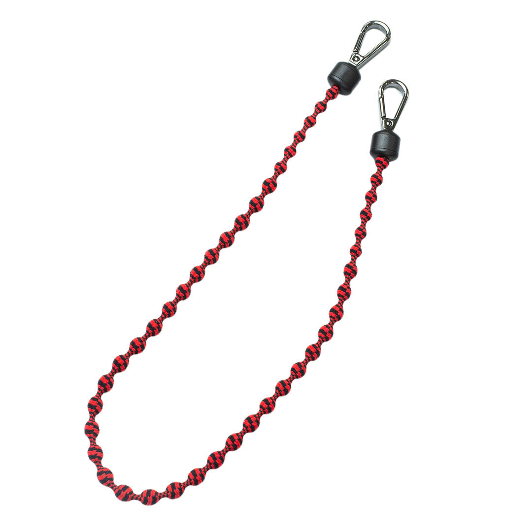 グラスコードのメインビジュアル 工具、鍵の落下防止に、テープの持ち運びに 絡まりにくい、コム紐仕様で軽量、コブが変形して荷重を吸収 グラスコードは伸縮する紐を使用。シリコンでどんな方ににもフィット。長さ調節も可能 グラスコードは一般使いにも