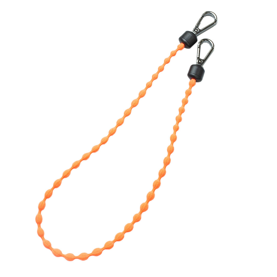 グラスコードのメインビジュアル 工具、鍵の落下防止に、テープの持ち運びに 絡まりにくい、コム紐仕様で軽量、コブが変形して荷重を吸収 グラスコードは伸縮する紐を使用。シリコンでどんな方ににもフィット。長さ調節も可能 グラスコードは一般使いにも