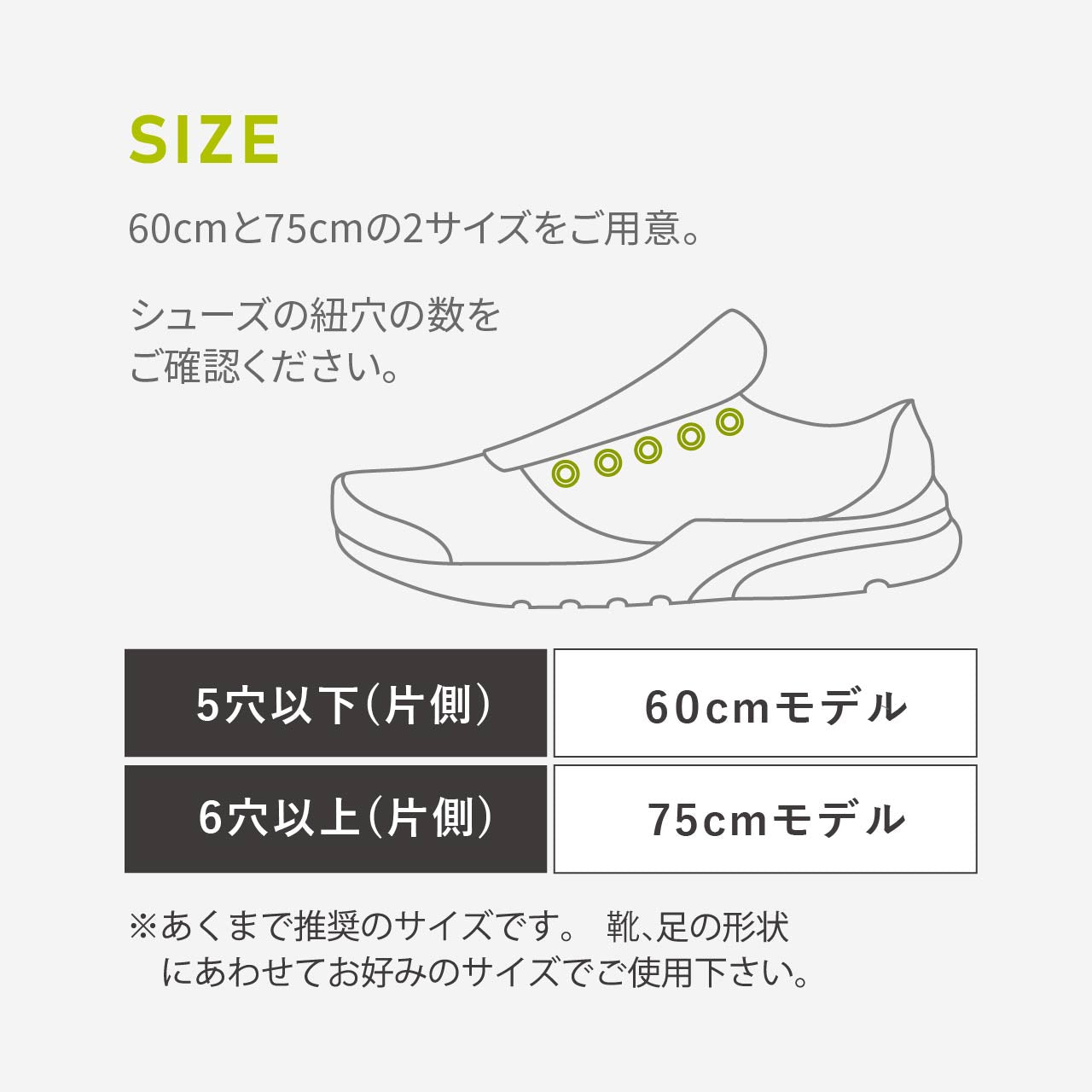 紐を余らせずに結ぶ場合、目安としては【片側5穴までが60cm】、【6穴以上が75cm】をオススメしています。
