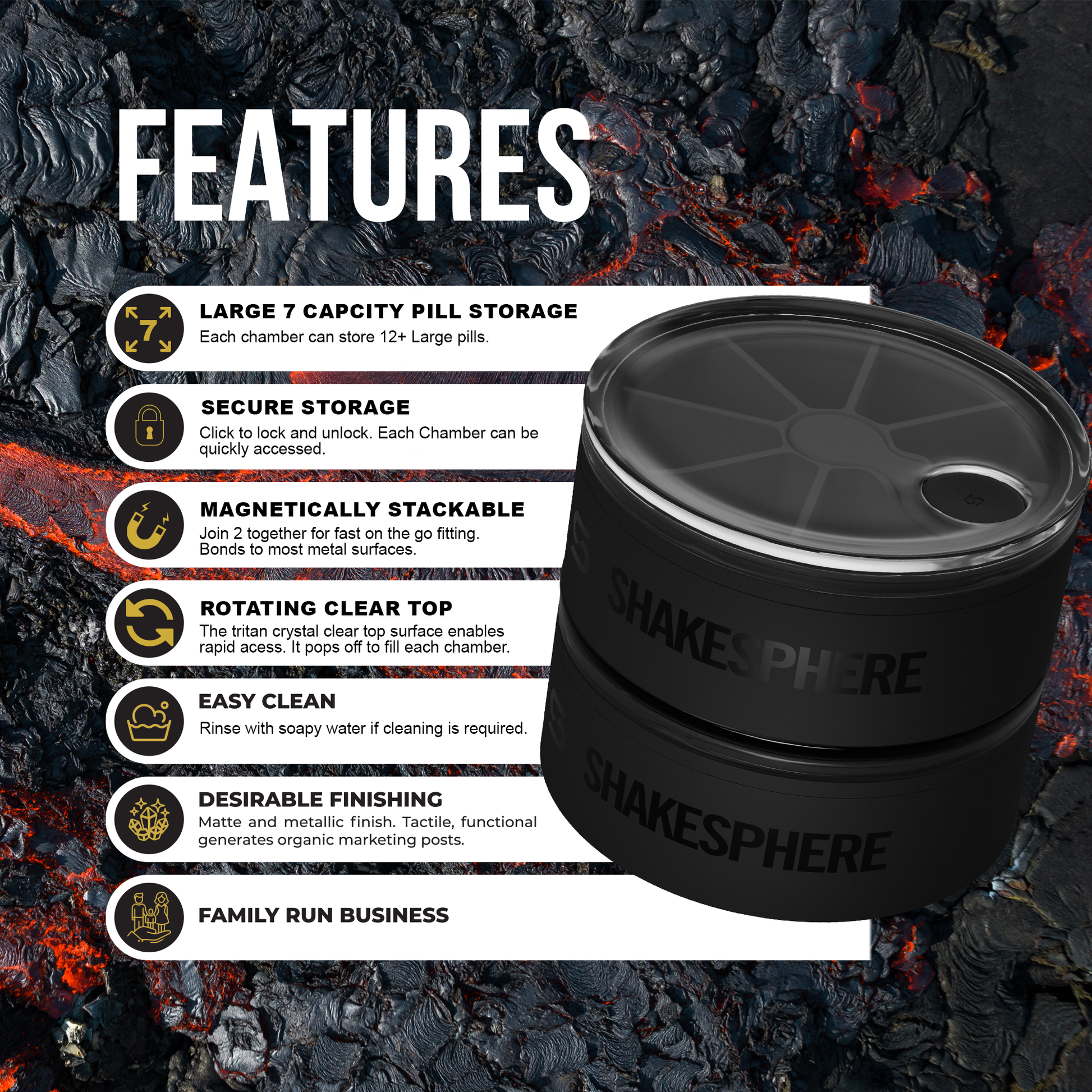 ShakeSphereは、ピル収納の概念を一新します。かさばって退屈な従来のプラスチック製ピルケースとは一線を画し、健康的なライフスタイルの一部として使いたくなる、スタイリッシュで実用的な新しい収納ソリューションを提供します。