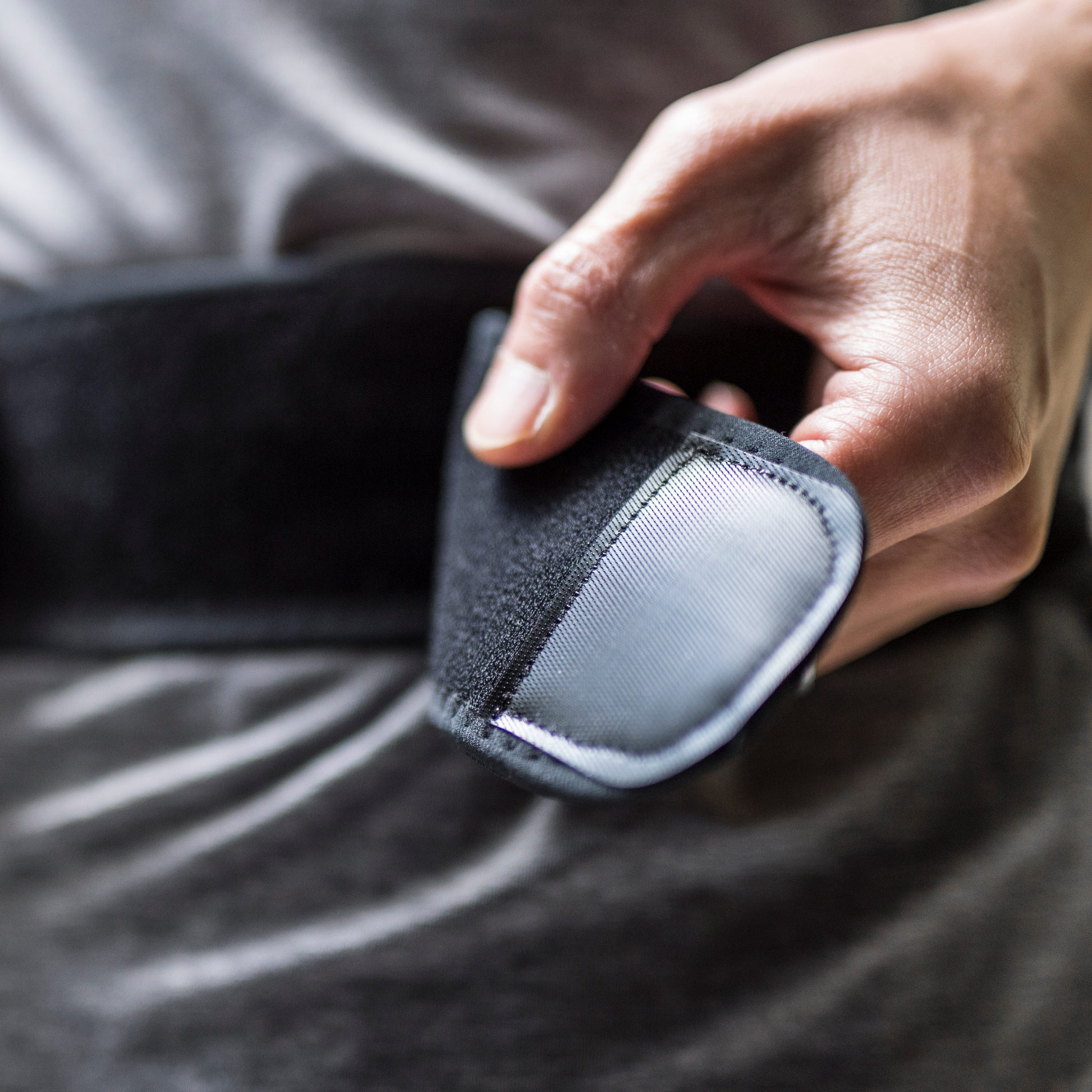 ランニングスタビライザーのベルトに採用されている装着テープは接着強度が一般的な装着テープの約3倍ある新素材を使用しています。