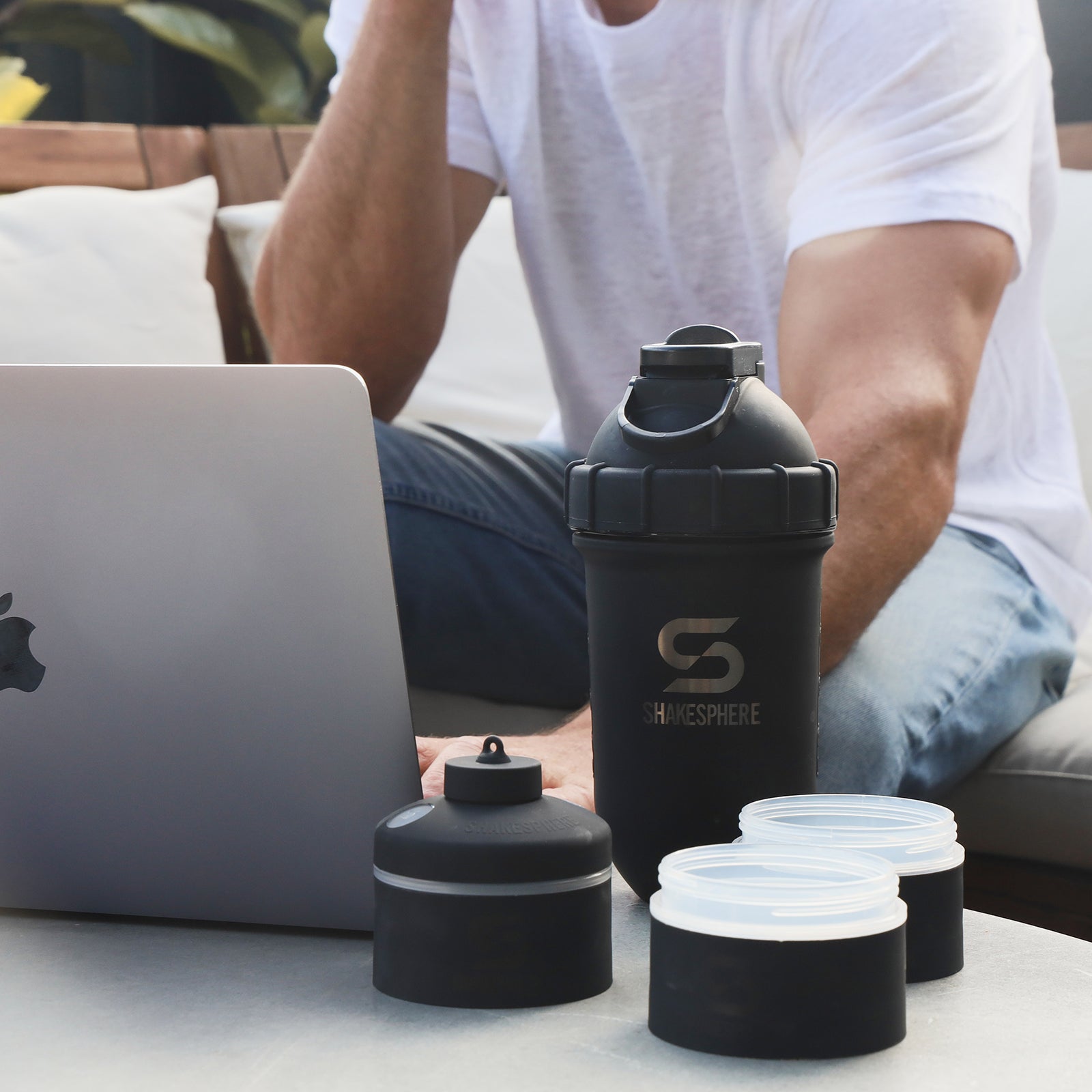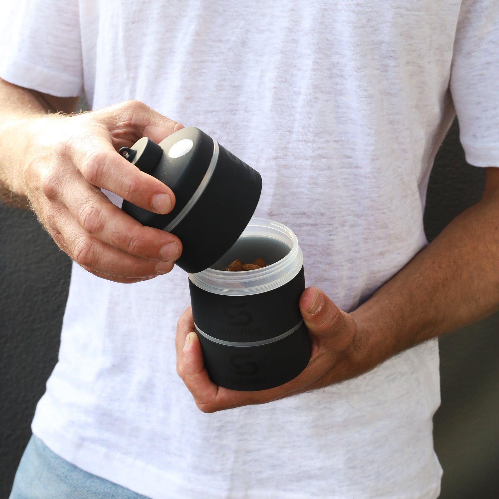 サプリメント、パウダー、ナッツ、ソフトフルーツなど、あなたのライフスタイルに合ったものをシンプルかつ革新的な方法で保管できます。ユニークな丸型ベースを備えた、積み重ね可能なスクリューフィットユニットが3つ付いています。シアンブルーの透明カラーの保存容器。各収納部はプレミアムマット仕上げで、ブラックのShakeSphereロゴが入っています。